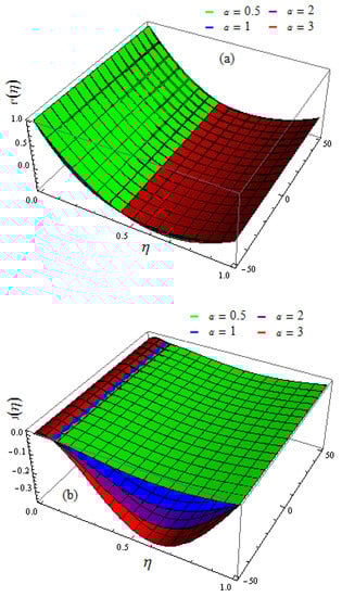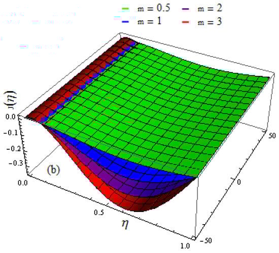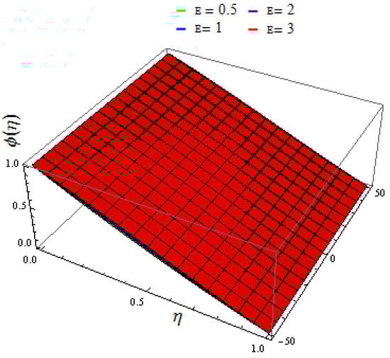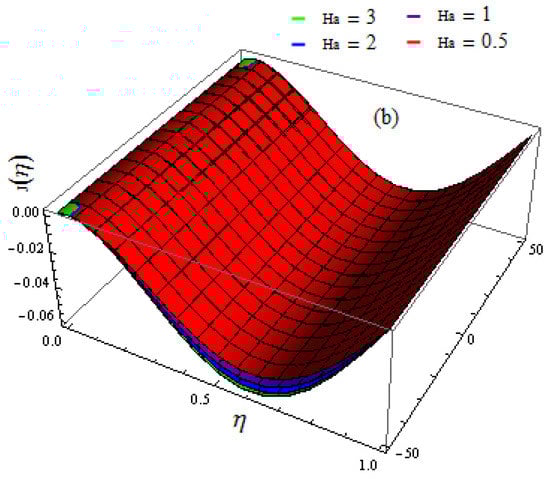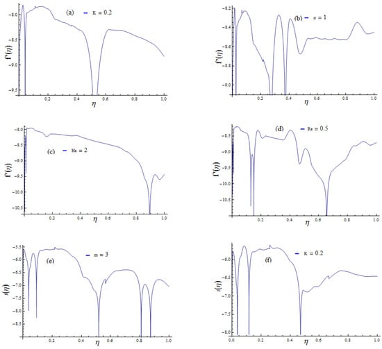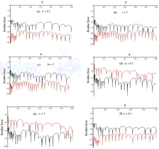 In the following graphs, we estimated the error solutions for different physical parameters involved in the model. From these figures, it is clear that our numerical solution is accurate as the error is too small. Figure 4a–f shows the error analysis of the physical parameters, , , , and on , and and on , respectively. From this figure, it is shown that our numerical computation is correct. Similarly, on the basis of working precision to compute the problem solution with working precision-22, the residue error has been computed shown in the red and black lines in Figure 3a–f. The black lines show the large residue error while the red line shows small residue error which confirms the solution.