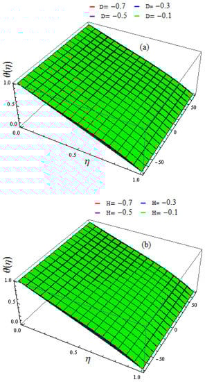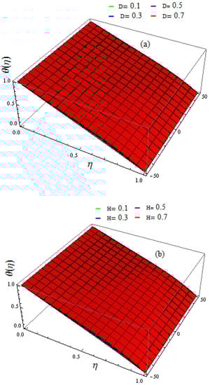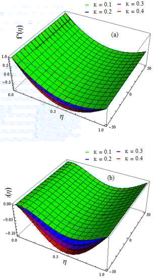 Table 2 investigates the effect of , , and on shear stress at the lower and upper walls. It is witnessed that as improves, shear stress increases at both walls, while when the value of increases, and decrease, so far as the shear force at the top is increased. When the rotation variable is amplified, the shear stress at the upper wall is increased. However, for , a reversed analysis is observed. Table 3 illustrates the inspiration of and on the heat transmission rate. The heat transmission is observed to be increasing when and values are increased. Table 4 shows the effect of various , and values on the mass transfer rate. It is realized that as and are enhanced, the mass transfer rate is increased at the bottom wall. However, decays with increasing , and values. The mass transfer rate decreases at the upper wall as and are increased but enhances as the values of , and are increased.