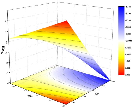 The nonlinear Equations (12)–(15) are solved numerically by using RK4 along with the shooting technique. The characteristics of the velocities , and temperature and the concentration for the non-dimensional variables arising in this study are represented graphically. Figure 5a,b demonstrates the impression of changing the suction factor on velocities. Since the lower plate sucked nanofluid, a large amount of fluid is ejected into the area around the lower plate. As a result, the velocities and are decreased due to the increase in the suction factor. The effect of the rotation factor on and is seen in Figure 6a,b. The Coriolis force, which operates normally to the velocity profile and the rotating axis in a rotating channel, opposes the fluid movement. As a consequence, there is a two-fold impression for . When is strengthened, the velocity drops in the nearest region of the lower plate while increasing in the uppermost part of the channel. It is observed that as increases, the velocity decreases. Figure 7a,b shows the magnetic variable Ha impact on and . The Lorentz force, which opposes the fluid motion, increases with the increasing values of the magnetic factor. In Figure 7a, there is a decrease in before the midpoint of the network, but there is a boosting nature in the high half of the channel. It is shown that on altering Ha, the fluid movement starts to deteriorate, as shown in Figure 7b. Figure 8a,b demonstrate the impression of the Reynolds number , since the Reynolds number is the proportion of inertial to viscous forces. As a result, as improves, inertial forces improve, while viscous forces decrease. A two-fold influence is observed for , but the velocity decreases. Figure 9a,b demonstrate the behavior of the Hall current variable on and . The effective conductivity greatly diminishes when is amplified. As a result, the magnetic damping force effect is significantly diminished. As seen in Figure 9a, the velocity of the fluid declines in the domain and increases in the of the channel. The fluid velocity decreases as increases. Figure 10 depicts the outcome of the thermophoresis variable on . For increasing 𝑁𝑡 values, nanoparticles travel from higher pressure to lower pressure fluid. It has been discovered that increasing strengthens thermophoretic force. As a result, an increment in is observed. Figure 11 highlights the inspiration of on . It has been determined that significantly increasing values lead to a significant heat gene ration due to nanoparticle collision. As a result, increases. Figure 12 portrays the influence of the radiation variable , implying the radiation factor and the random motion of the nanoparticles increase, providing the additional energy inside the fluid. As a consequence, the temperature of the fluid is increased. Figure 13 explores the influence of thermal factor on the temperature profile . The increment in improves the random motion of nanoparticles, which increases the heat function and causes an increase in the temperature inside the fluid. Figure 14a,b and Figure 15a,b demonstrate the presentation of the variable heat source/sink on temperature . It is observed that increasing the amount of the variable heat source variable corresponds to significantly increased heat generation. As a result, the temperature increases. However, when the variable sink value is significantly changed, the nature of deteriorates, owing to the inner absorption of heat. Figure 16 explores the influence of Schmidt number Sc on the concentrated field. It is perceived that by increasing , the concentration field decreases, owing to a lessening in mass dissemination. Figure 17 and Figure 18 show the effect of the Brownian motion and thermophoresis variable on concentration field . It is observed that is declined with the increasing values of and enhanced with the growing values of By increasing , the random motion of nanoparticles improves, which enhances the concentration profile. Random mobility among the fluid molecules upsurges as increases. In conclusion, by amplifying , fluid concentration deteriorates. Figure 19 exhibits the outcome of the dimensionless chemical reaction parameter on . The chemical molecule diffusivity decreases as a result of reaction processes. As a result, the fluid concentration decreases. Figure 20 exhibits the influence of activation energy values. It is observed that higher values cause a reduction in the Arrhenius function. As a result, the chemical reaction decreases. As is increased, so does the fluid concentration. Figure 21 depicts the outcome of the temperature difference of variable on . A poorer concentration profile is observed as the temperature difference (at the surface and far away from the surface) escalates. Similarly, the effect of physical parameters such as the magnetic parameter , Schmidt number , and Brownian motion parameters on the skin friction and the Sherwood number is depicted in Figure 22 and Figure 23. From Figure 22, it is quite clear that the skin friction increases as the magnetic parameter increases. This is because when the magnetic field is applied, the Lorentz force is developed as a result. Due to this, the Lorentz skin friction increases. Similarly, the Sherwood number increases with the increasing values of and , as shown in Figure 23.