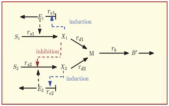 Reaction scheme for the diauxic growth network. , are the substrates, , are the intracellular metabolites, , are the enzymes, M is the intermediate metabolite, and is the main Biomass. The reaction rates are indicated in (solid arrows), catalytic activities and regulatory interactions in (dashed arrows).