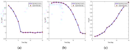 The behavior of the model order reduction method strongly depends on the decay of the singular values of the snapshot matrix. Figure 2 shows gradually decaying singular values with a strong decay for the smallest singular values indicating that ignoring these will not lead to any considerable loss of information. We truncate the most dominant singular values such that the relative information coefficient I is close to one. In this example, we use where . The date-fitting function is constructed as in Section 2.3 to fit the experimental data set for the three measurement components , and B at the measurement time points . The trajectories of the measurement data set and the data-fitting function are depicted in Figure 3.
