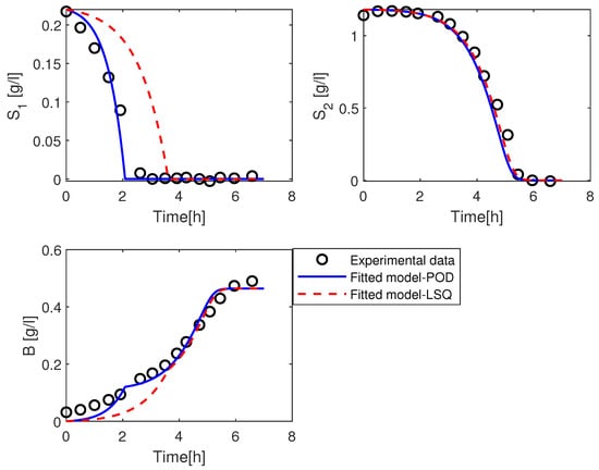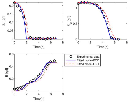 We can observe that the dynamical behavior of the kinetic model states with parameter value matches well with the experimental data for the substrates , , and the Biomass B. While the simulation of the solution of the kinetic model with parameter value for the substrate is unable to match well with the data. The substrate spends more time to consume compared to the measured data. In contrast, the trajectories of and Biomass still fit good with the measured data. From the above figure, the POD method gives better results than the LSQ method. Note, that with a change of the lower and upper bounds in the LSQ method, we could obtain a better result. Both methods are sensitive to assumptions, which means that the lower and upper bound of parameter value , the mesh size M, and the reduced basis can be adjusted to obtain a good fitting.