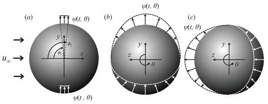 As discussed above, previous studies on the distributed forcing typically adopted a steady forcing with fixed locations of the maximum magnitudes for blowing/suction actuations [5,6,19]. In the present study, we propose an unsteady distributed forcing and apply it to the turbulent flow over a sphere, a representative three-dimensional and axisymmetric bluff body. In this approach, we impose an unsteady distributed forcing on the sphere surface, for which the locations for the maximum blowing/suction amplitudes periodically rotate in the azimuthal direction over time (see Figure 1). This periodically rotating distributed forcing is different from previous time-periodic forcings [15,18] in that its forcing profile retains a large-scale variation in the space and it satisfies the instantaneous zero net mass flux. The goals of the present study are to assess the performance of the periodically rotating distributed forcing in reducing the drag exerted on the sphere and to analyze the near-wake characteristics modified by the control. The control strategy and numerical details are described in Section 2. The control results are presented and discussed in Section 3, followed by the conclusions in Section 4.