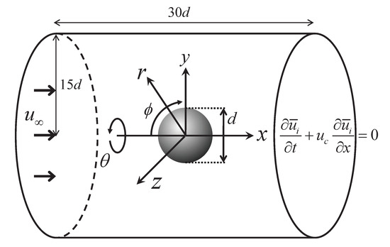 A staggered grid system is employed in this study, and thus, and are defined at the cell face, whereas p and q are defined at the cell center. A fractional-step method [25] is adopted for the decoupling of the pressure and the velocity in the Navier–Stokes equation. In this study, we use a second-order semi-implicit time advancement scheme consisting of a third-order Runge–Kutta method (RK3) for the convection term and the second-order Crank–Nicolson method (CN2) for the diffusion term [26]. Mainly, the second-order central difference scheme is used for the discretizations of spatial derivative terms, while a third-order QUICK scheme is partly used for the discretization of the convection term in the laminar acceleration region over the sphere [27].