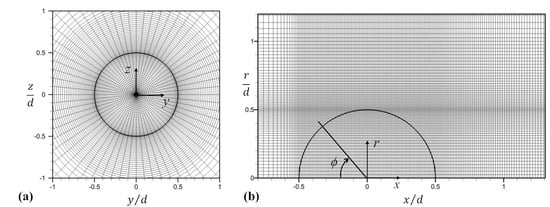 Grid distributions near the sphere: (a) in y–z plane; (b) in x–r plane. Every other grid is shown.