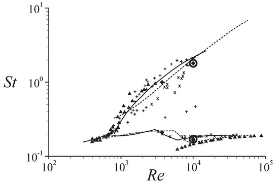 The frequencies corresponding to the shear layer and wake instabilities are obtained from the time traces of radial velocities near the shear layer () and in the wake (), respectively [27]. Figure 4 shows the variations of Strouhal number corresponding to these shear layer and wake instabilities with the Reynolds number from the present simulation and previous experimental and numerical studies. In this figure, with increasing the Reynolds number, the high frequency associated with the shear layer instability increases, while the low frequency associated with the wake instability exhibits mild variations [35]. It is evident that these frequencies at are successfully predicted by the present simulation, indicating the accuracy of the present numerical approach.