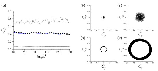 Based on the discussion in the preceding paragraph, the control results from the present periodically rotating distributed forcing can be divided into three categories: low-frequency ineffective (), effective drag reduction (), and high-frequency saturation () regimes. To illustrate the temporal evolutions of forces for these regimes, the time traces of the drag and lift coefficients for cases with typical forcing frequencies of , and 5.0 are shown in Figure 6. In Figure 6a, it is clear that the drag owing to the control with is reduced by about compared to that of the uncontrolled flow. On the other hand, the control with increases the drag, while the control with produces a similar value of drag to that without control. As expected from Figure 5, the amplitudes of lift fluctuations increase at and 5.0 (Figure 6c–e) compared with the case of the uncontrolled flow (Figure 6b). We note that, as shown in the figure, ’s move around for all control cases, indicating that the present control does not produce an undesirable non-zero mean lift force. From Figure 6b–e, instantaneous lift coefficients on the y–z plane show two different types of temporal behavior. In the cases of the uncontrolled flow and low-frequency ineffective regime (Figure 6b,c), the lift coefficients on the y-z plane move irregularly around the center of (0, 0) over time. On the other hand, in the cases of effective drag reduction and high-frequency saturation regimes (Figure 6d,e), lift forces move in the counterclockwise direction (when viewed from the downstream), which is the same direction as the rotating direction of forcing in Equation (1).