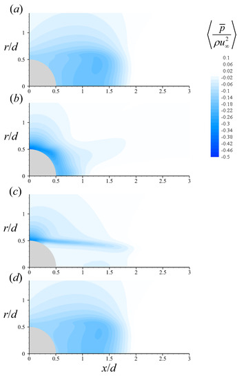 Contours of the averaged pressure in the near wake of the sphere with various forcing frequencies (): (a) uncontrolled flow; (b) ; (c) ; (d) . Here, denotes the averaging over time and azimuthal direction.