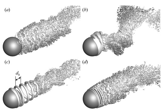 Figure 8 shows instantaneous three-dimensional vortical structures in the turbulent wake of the sphere identified using the method [46] with the typical forcing frequencies of and 5.0. Compared to the vortical structures of the uncontrolled flow in Figure 8a, the vortex shedding in the wake with the control at is strengthened owing to the lock-on phenomena [43], and the vortical structures behind the sphere exhibit a distinct waviness along the streamwise direction (Figure 8b). In the case of (Figure 8c), it is observed that a helically rotating vortex forms and dissipates in the shear layer of the sphere, which is generated from the blowing actuation of distributed forcing on the sphere surface. The streamwise distance for this helical vortex shown in Figure 8c is measured to be about . It is noteworthy that this distance for the helical vortex is similar to the value measured for the vortex rings from the periodic forcing by Oxlade et al. [18]. In the vortical structures with the control at shown in Figure 8d, the helical vortex is created from the forcing slot, but it is so thin that it quickly disappears as it travels downstream. This behavior suggests that the high-frequency forcing is not so effective in changing the vortical structures in the wake.