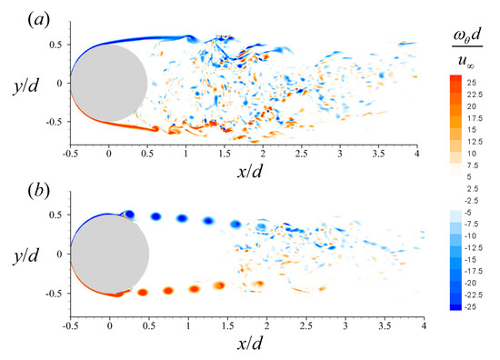 Figure 9 illustrates contours of instantaneous azimuthal vorticity () on a x-y plane for uncontrolled and controlled flows. For the uncontrolled flow shown in Figure 9a, the growth of the laminar boundary layer, flow separation, evolution and roll-up of the shear layer, vortex shedding in the wake, as well as vivid small-scale vortices are visible. Consistent with the three-dimensional vortical structures in Figure 8c, the staggered formations of vortices in the upper and lower shear layers of the sphere by the control (Figure 9b) indicate the evolution of the helical vortex in the shear layer, and these vortices disappear as they travel downstream. After the helical vortex starts to disappear around , the turbulent wake exhibits small-scale vortices.