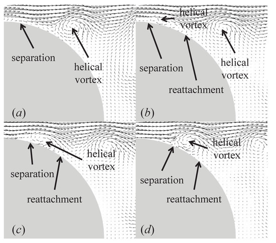 To understand the detailed process for the generation of helical vortex, Figure 10 displays instantaneous velocity vectors on the x-r plane () in the near wake at different temporal instances for the case of and in the effective drag reduction regime. At in Figure 10a, flow separation occurs upstream of the helical vortex. At in Figure 10b, it is observed that the helical vortex at moves downstream in the shear layer, and in addition, a small helical vortex generated from the blowing forcing is also visible on the surface of the sphere. Here, T denotes the temporal period defined to be . At this time instance, it is evident that a flow reattachment occurs on the sphere surface between these two helical vortices. A similar behavior was also observed in the time-periodic forcing by Jeon et al. [15]. At and in Figure 10c,d, respectively, these two helical vortices travel downstream, and hence, the instantaneous locations of flow separation and reattachment are also further delayed on the sphere surface. Compared to the separation point of the uncontrolled flow (see Table 1), it is certain that the separation point is much delayed at all instances, which reduces the drag on the sphere. The mean separation and reattachment points are and , respectively. We note that the separation delay for flow over a bluff body is generally favorable to the base pressure recovery and drag reduction [4].