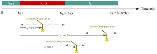 The calculation process of is similar to that of . In this regard, we know that if the tagged freight vehicle arrives during the interval (extension interval), the expected waiting time is 0 (). On the other hand, if the tagged freight vehicle arrives at time , the corresponding expected waiting time is given by