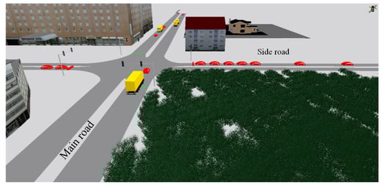 Accelerations of regular vehicles and freight vehicles are not accounted for in the model; instead an average speed is assumed. The average speed at which a regular vehicle leaves an intersection can be taken as 10 m/s. For freight vehicles, this average speed depends on both the power of the engine and the weight of the truck, and the load it is carrying. A rough estimate of 5 m/s was made based on the results of field tests []. It should be noted that special vehicles such as agricultural vehicles are not accounted for, as their presence is limited on primary roads.