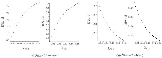 where is the indicator function of event A; i.e., if A is true and 0 otherwise. The first term of Equation (7) equals the remaining red time; the second term summarizes the contribution of freight vehicles in front of the tagged vehicle; and the third and fourth terms describe the contribution of the regular vehicles in front of the tagged vehicle when there is no freight vehicle or when there is at least one freight vehicle in front of the tagged vehicle, respectively. The different denominators in these last terms correspond to the different speeds of dissipation of the overflow queue when the light turns green if a freight vehicle is present or if it is not. Under the assumption of Poisson arrivals with rates and for the regular and freight vehicles, Equation (7) is further detailed as: