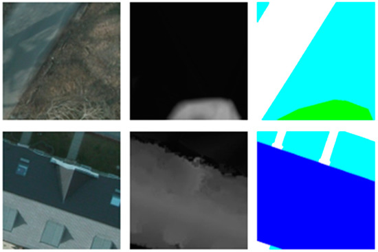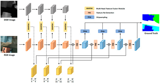 HSR remote sensing images’ semantic segmentation involves the application of image semantic segmentation in the field of remote sensing, which aims at extracting different types of ground objects from remote sensing images. Remote sensing image semantic segmentation technology is widely used in unmanned driving, geological detection, urban planning [1,2,3,4,5] and other fields [6,7,8,9,10,11], and its great significance in modern production and life is self-evident. HSR remote sensing images have rich semantic information, but the task of semantic segmentation is challenging, due to the large intra-class variance and class imbalance. For example, the difference among ground objects in remote sensing images is too small, and the sense of a boundary between different surface features is not strong. The shadow caused by illumination influence can be occluded; there is also a tremendous difference in the number of different ground objects. In Figure 1, the representation of the low vegetation (shown as cyan in the labeled image) and the tree (shown as green in the labeled image) in the first row of RGB images is so similar that it is difficult to identify the difference between the two. However it is clear in the DSM (digital surface model) image that the area where the tree is located is brighter (higher in height).In the second row, the illumination led the house (shown as dark blue in the labeled image) to have different colors in the direction of sunrise and non-sunrise, with the non-sunrise roofs being darker. However, in the DSM image the two reversals show the same features due to being the same height. From the labeled image, we can determine that there is also a category of grass. The shading makes its representation extremely similar to that of the roofs in the non-sunrise direction, and the boundary between the two categories of surface features is very blurred.