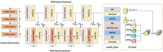 As shown in Figure 4, we use a combination of lightweight modules in the feature extraction module. This mainly includes the depth-separable convolution module and the C4 module used in mobilenet v2 [45]. As DSM images contain only height features, whereas RGB images contain a variety of features such as color and texture, different feature extraction modules need to be designed for these two types of images. For convolutional neural networks, the more layers there are, the richer the features acquired. Therefore, we choose a deeper network when designing the RGB feature extraction module. At the same time, remote sensing images have the problem of being multi-scale, with tremendous variations in the orientation, shape, and scale of instances in the images [39]. The C4 module decreases the impact of the multi-scale problem by combining convolutions with different expansion rates, similar to a lightweight ASPP.