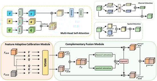 As shown in Figure 5, the multi-head feature fusion module is divided into two parts: the feature adaptive calibration module and the complementary fusion module. For complementary and redundant information in different modalities, our aim is to remove redundant information while retaining complementary information, and to enhance the representation of complementary information and attenuate redundant information by adaptively calibrating both features through a multi-headed attention mechanism. After feature calibration, we use a complementary fusion module to calculate the fusion weights of the two modality (the sum of the two weights is 1) for complementary feature fusion.