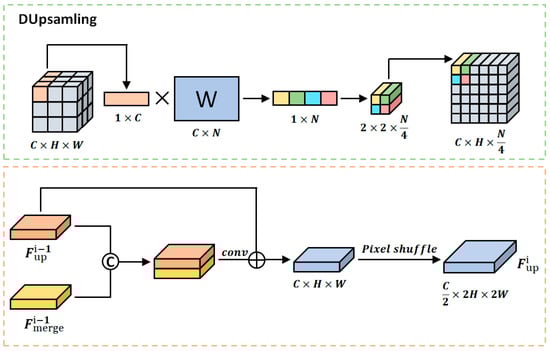 Accurately recovering the resolution of the feature maps during upsampling is key to achieve the recognition of a small object. Traditional upsampling is often achieved using a combination of bilinear interpolation and convolution. However, bilinear upsampling does not take into account the correlation among the predictions of each pixel and can lose some details of a small object. We therefore use a data-dependent upsampling method here, especially for low-resolution feature mapping, to achieve better segmentation accuracy. For features with different scales, DUpsampling is used to recover the features with small resolution to the maximum resolution uniformly, and finally the final classification result is obtained through concatenation and convolution operations. Figure 6 shows the details in the decoder.