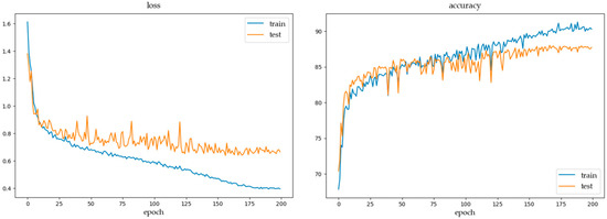 Figure 7 shows a graph of the change in loss function and accuracy during the training process. It can be seen that after 150 epochs, the training loss is still gradually decreasing, while the test loss has a slight increase. Thus, we chose to stop training after 50 epochs. Between 175–200 epochs, the training loss has converged and the test loss fluctuation value has become smaller. Finally, we chose the model with the smallest test loss between 175–200 epochs as the final evaluated model parameter. The same situation can be observed in the line graph of accuracy.