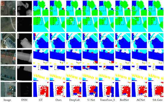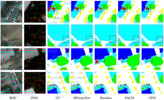 The results of feature visualization are included in Figure 8. For images with different modalities, it is clear from the results of feature visualization that they have different valid information, with RGB images being more sensitive to color and texture information and DSM images being more sensitive to height information. Effectively combining the information from different modalities will be of great help in improving the semantic segmentation accuracy.