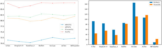 As can be seen from Table 4 and Figure 10, the multi-modal model outperforms the unimodal model in terms of accuracy metrics. However, with the same backbone, the parameters of the multi-modal model are more than twice as large as those of the unimodal model. The multi-modal model enriches the information sources due to its multiple source inputs, but likewise introduces a huge number of parameters and large amount of computational effort, and it requires two backbone networks to handle the different modal inputs. As can be seen in Table 4, our model has half the number of parameters and 1/10 the computational effort of U-Net, and our model achieves the effect of the multi-modal model in all accuracy metrics while reducing the model size as much as possible. In addition, we do not use training weights in our experiments, but the accuracy still reaches that of other models using pre-trained weights. This evidence illustrates that MFTransNet achieves a good balance between model size and performance.