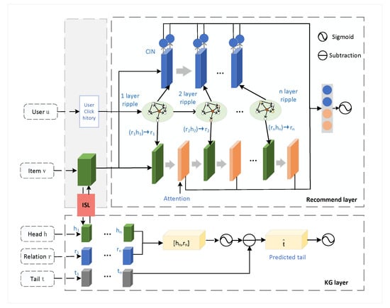 The overall framework of our proposed AKNEI is shown in Figure 1. The input of the recommendation layer is user and item embedding, and the input of the KG layer is a triple graph G. The recommendation module is a set of ripple graphs composed of user click history, where k is a ternary set of knowledge graphs of each layer of ripples. These collections interact with item embeddings, and the attention module is used to extract each layer of interactive information to form embeddings. CIN conducts high-level interactions with the item embeddings on the user preferences of each layer of the ripple network, forms the final embedding with the information extracted by the attention, and finally makes predictions. The ISL layer establishes a low-level information-sharing channel between the recommendation task and KGE, which can automatically learn feature interaction and complement information.