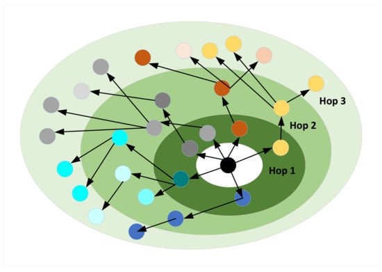 Ripple propagation diagram. Dots are entities, colors represent different categories, and arrows are the relationships between entities. As the number of hops between entities increases, the correlation decreases.