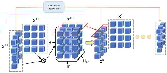 where is a mapping matrix. The product operation of vector and matrix can map vector to -dimensional space, is the j-th column vector of the embedding matrix , is the embedding vector of the ripple network corresponding to the CFFN propagation layer, is the kth layer output matrix in the cross feature fusion network, and the number of feature vectors is expressed as . Set the first layer to , , and to be the parameter matrix of the h-th eigenvector. ∘ represents the Hadamard product, for example, . The number of cross feature fusion layers determines the degree of high-order feature interaction. The pooling operation connects the output layer and the hidden layer, so the output of each layer depends on the previous hidden layer and additional layers. Therefore, it can be ensured that the output unit can obtain characteristic interaction modes of different orders. The above formula is closely related to the CNN, as shown in Figure 5. The intermediate tensor is introduced, which is the outer product of the hidden layer and the n-th ripple propagation embedding matrix . This tensor is similar to the graph in CNN, the embedding dimension d can be seen as the number of channels, and is a filter that extracts the features of the d layer to obtain the hidden vector . Figure 1 shows the propagation process of the cross feature fusion network in the model. We set the maximum number of layers as T and then and connect all the layers as follows: