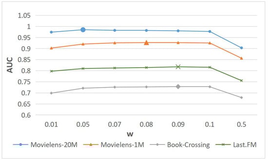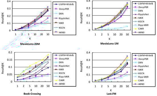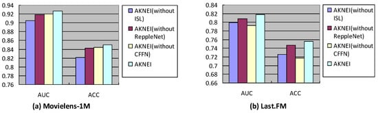 - It can be seen from the experimental results that the AKNEI model proposed in this paper performs better than the baseline model mentioned above on the four datasets. In the MovieLens-20M dataset, the AUC increases by 1.1–18.6%, and the ACC increases by 2.3–19.9%. AUC in MovieLens-1M increases by 1.6–29.3%, ACC increases by 1.9–30.7%, AUC increases by 0.5–16.1% in Book-Crossing, ACC increases by 0.2–14.7%, Last.FM AUC increases by 3.1–26.6%, and ACC increases by 0.7–23.1%. This proves that our model has a higher utilization of user behavior data.