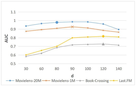 We conducted an experimental analysis on the relationship between the size of the embedding dimension and the expressive power of the model. The change of the model with the embedding dimension is shown in Figure 8; the performance of the model will increase as the embedding dimension increases, and will decrease after reaching the critical point. Because a larger dimensional embedding can increase the expressiveness of the model, but the model will fit more noise, too-high dimensional embedding will cause the model to appear as over-fitting.