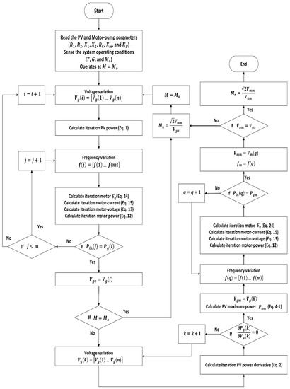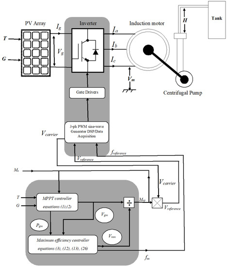 Using Equations (3), (12), (13), (16) and (26), the optimum modulation index Mop and voltage-frequency patterns () can be determined to achieve optimum flux drive at PV-MPPT. The controller is set to change the modulation index within its linear region 0 ≤ M ≤ 1, and acts as an MPPT element beside the maximum efficiency element.
