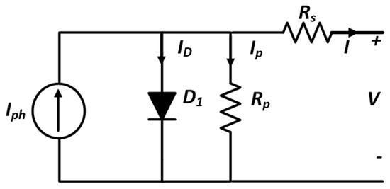 The equivalent circuit of the PV module is represented by a single diode in parallel with a current source with series and parallel resistances as depicted in Figure 2.