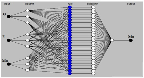 Using a fuzzy system to represent knowledge, controller design has the learning capabilities of a neural network and may directly modify the membership function parameters based on data to enhance system performance [48,49]. The ANFIS network is based upon a first-order Takagi–Sugeno model and is comprised of five layers.