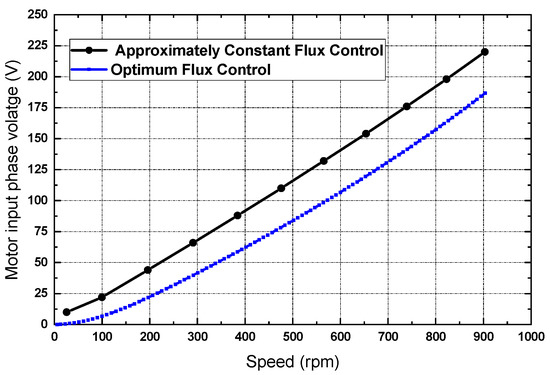 Motor input voltage variation with speed at approximately constant and optimum flux operation.