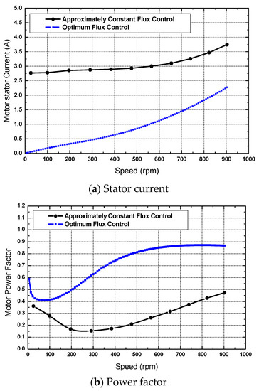 The motor power factor is increased extensively with the proposed optimum flux method. The power factor reaches nearly 0.9 while 0.5 for the proposed and constant flux control methods respectively as in Figure 7b. The optimum flux control method results in a considerable increase in power factor and a significant decrease in stator current, which significantly improves motor efficiency as illustrated in Figure 7c.