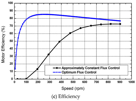 The motor characteristics for both approximately constant and optimum flux operation will be explored. When using the optimal flux control technique, the motor draws less current than when using the constant flux control technique at low speeds, as in Figure 7a. This reduction was nearly 67% at 900 rpm.