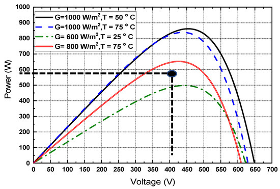 The primary goal of the presented work is to increase the water flow rate while maximizing the amount of energy that is gathered from the PV system by boosting the IM efficiency at various environmental variations. As previously discussed, both changes in temperature and solar irradiation have an impact on the power generated by PV panels. The simulated power/voltage characteristics of the PV module are depicted in Figure 8. From this figure, it is obvious that the operating temperature and solar insolation have an impact on the maximum power point.