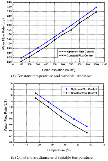 In this instance, the water flow rate will be examined to evaluate the performance of the suggested optimal flux control over the fixed flux one through studying two different scenarios. Those are steady temperature and fluctuating irradiance, and the opposite in the alternate case. Figure 9a,b showed that, in the two scenarios, the given optimal flux control could function more effectively than the fixed flux control. The obtained results confirm the fact that the PV output power is inversely related to temperature and directly proportional to irradiation.