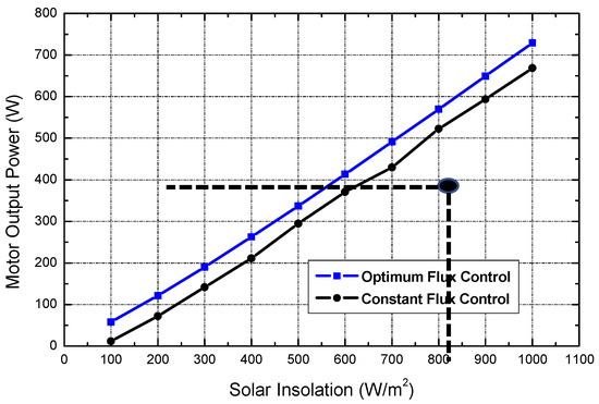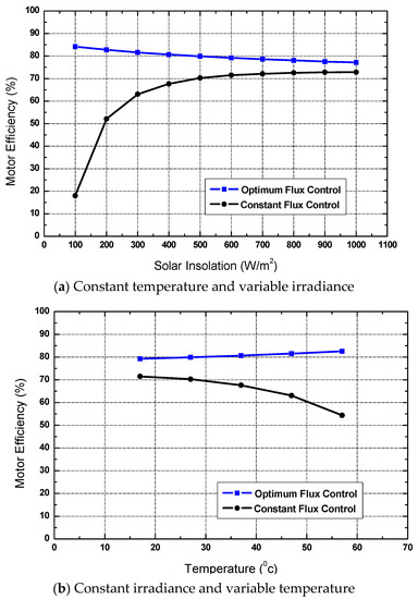 The motor efficiency was maximized by the optimal flux control described in this research at ranges of 80% with irradiance fluctuations from 100 w/m2 to 1100 w/m2 at a fixed temperature of 25 °C, as shown in Figure 10a. The motor efficiency was relatively low in this case, with a range of less than 50% at lower irradiance levels with constant flux regulation, as shown in Figure 10a.