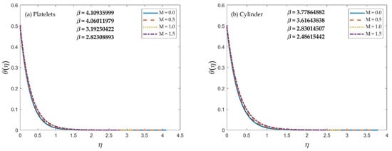 Figure 2 illustrates the effect of multi-shape nanoparticles with respect to the film thickness of nanofluids. In this case, the remaining physical parameters remain constant. Provided that the nanoparticles’ shape changes, the film thickness also drastically changes. Furthermore, the velocity profile and film thickness accelerate for the platelet-shaped nanoparticles and decelerate for the brick, cylinder, and sphere-shaped nanoparticles. Figure 3 shows the impact of the slip parameter on the temperature profile for multi-shape nanoparticles. The temperature profile for each multi-shape nanoparticle increases as the slip parameter rises. The enhancement of the slip parameter has resulted in acceleration of the fluid within the boundary layer. Additionally, the current study’s reflection of the convective heating effect, which controls the temperature of the stretched surface, may have contributed to this phenomenon. In reality, increased convection causes higher surface temperatures, allowing the thermal impact to go deeper into the nanofluid. Next, Figure 4 illustrates the magnetic parameter effect on the temperature profile . Having higher levels of the magnetic parameter , the temperature becomes greater for all types of nanoparticle shapes. The Lorentz force, which acts as a reverse force when magnetic effect is present, causes this. This force increases the fluid’s friction by opposing the fluid’s motion. It is a resistive force; hence, fluid friction causes the temperature to rise. Figure 5 illustrates the effect with respect to the mixed convection parameter towards the temperature profile . Furthermore, note that the temperature reduces provided the buoyancy parameter boosts (from opposing to assisting). However, it is important to point out that, for platelet and cylinder shapes, the temperature receives less impact. Near the wall, the assisting flow has a lower temperature than the opposing flow. The assisting flow, in theory, transfers heat from the hot plate to the cool fluid, eventually bringing the wall temperature down.