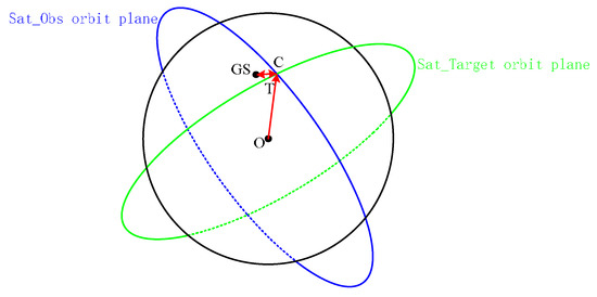 The intersection vector of the Sat_Obs orbital plane and Sat_Target orbital plane is set as , which can be expressed as follows: