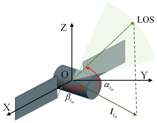 An ISAR observation and imaging model of a three-axis stable space target is shown in Figure 5, in which O-XYZ represents the orbital coordinate system. In the long-term continuous observation process, the radar line of sight at each observation moment forms a green curved surface in Figure 5. Among these, the direction vector of the radar line of sight at time is determined by pitch angle and azimuth angle . Specifically, is the angle between the radar line of sight and its projection vector on the XOY plane, and is the rotation angle of and the X axis in the counterclockwise direction, with and . The radar line-of-sight direction vector at time can be expressed as follows: