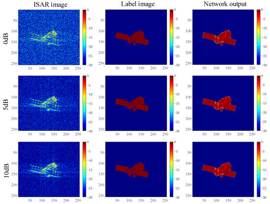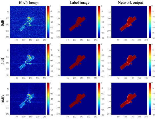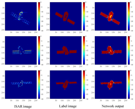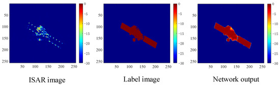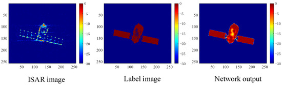(2) ISAR image enhancement: First, ISAR imaging results were taken as network inputs, and UNet++ was trained with theoretical binary projection as the label. After training UNet++, ISAR imaging results were randomly used for testing. An imaging result is shown in Figure 9. It can be seen that the network output and theoretical binary projection results were similar after the ISAR imaging results were enhanced by the proposed method, which proved the effectiveness of the proposed method.