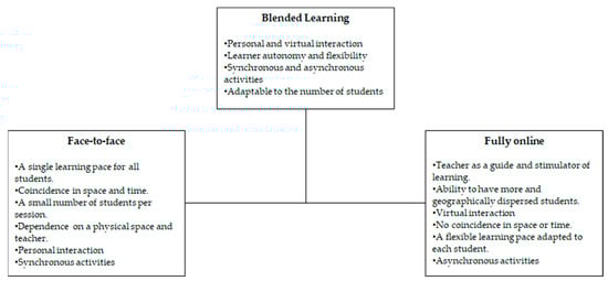 As can be seen in Figure 1, the face-to-face and fully online models present totally opposite and different characteristics. BL, on the other hand, is not a disruptive model with respect to either the fully online or the face-to-face models but rather integrates the benefits of both models to form a new model that enhances student learning.