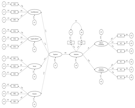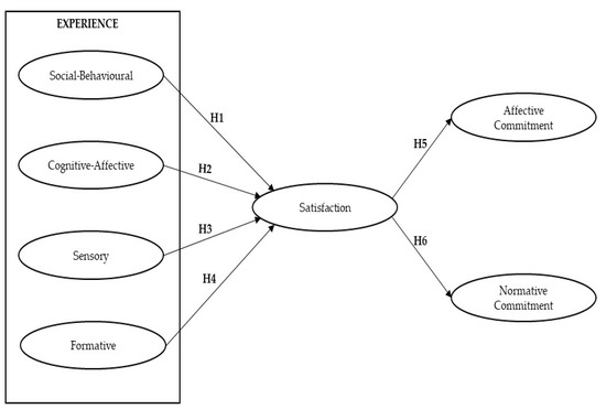 Based on the above, the conceptual model shown in Figure 2 depicts the proposed model and the hypotheses put forward. The model shows the social-behavioural, affective–cognitive, sensory and formative experience dimensions, as well as the resultant satisfaction and, in turn, normative and affective commitment.