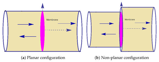 where a and b are constants and are being used here to represent the length of the radii of sections lying along and respectively. Clearly, for planar geometrical configuration, which is shown by Figure 1a, we take , whilst, for non-planar geometrical configuration, which is shown by Figure 1b, we consider .