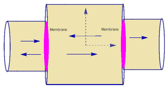 The current study will focus on the reflection and transmission of acoustic waves from the elastic membranes attached at the mouth of the chamber at interfaces together with the step-discontinuities. The physical system of the considered setting governs a differential system, which includes Helmholtz’s equation, elastic membrane conditions, rigid conditions, and edge conditions. To solve the aforementioned differential systems, an analytic and/or semi-analytic techniques are found to be useful. One of the main studies for solving such differential systems in the absence of elastic membrane conditions for a cylindrical channel was offered by Miles [9]. Later, Levine and Schwinger [10] considered a semi-infinite, acoustically rigid cylindrical duct and applied the Wiener-Hopf technique to solve the governing differential equations. Likewise, Ingard [11] used the Wiener-Hopf technique to discuss the scattering of piston radiation in a cylindrical duct containing one open side. The envisaged problems usually involve the governing equation to be either a Helmholtz or Laplace equation, and the boundary conditions to be Dritchet, Nuemann or Robin types. Until now, numerous analytical, semi-analytical, and numerical techniques have been advanced to address a variety of different physical problems; for instance, see [12,13,14,15].
