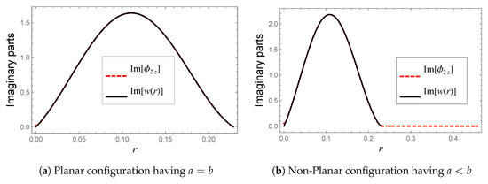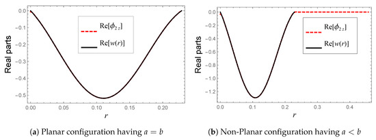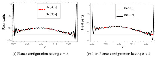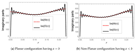 Note that r in subscript denotes differentiation with respect to r. On substituting the truncated form of expansions from (8), (11), and (12) into (39) and (40), and then plotting the resulting and against r, where , we achieve Figure 5 and Figure 6. From these figures, it is found that the real and imaginary parts of and coincide in the assumed regime, which assures that a sufficient number of modes in the truncated solution have been retained.