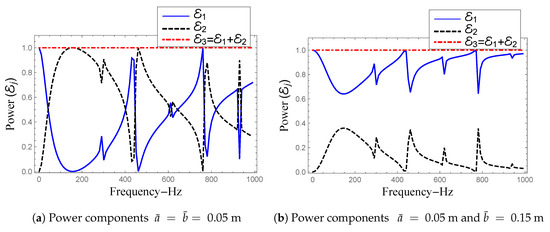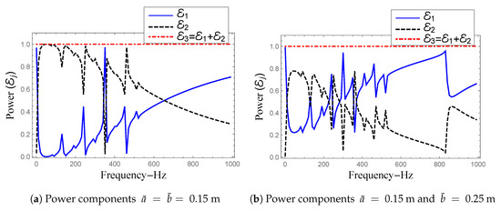 represent the reflected and transmitted powers, respectively. Here, the quantities and express the number of cut-ons in regions having radii a and b, respectively. In Figure 7 and Figure 8, the scattering powers and and their sum are plotted against frequency varying from 1 Hz to 1000 Hz. The radii of duct regions in Figure 7 and Figure 8 are changed. To obtain the graphs of Figure 7, we choose the dimensional radii of duct regions, such as, for planar configuration, m, whereas, for non-planar configuration, m and m. Accordingly, to obtain the graphs of Figure 8, we choose the dimensional radii of duct regions, such as, for planar configuration, m, whereas, for non-planar configuration, m and m. From these graphs, it is observed that the scattering powers fluctuate periodically against frequency and depend upon the size of the membrane at the interface as well as the radius of structural discontinuity. Note that parts (a) of Figure 7 and Figure 8 depict the results against frequency of the planar setting () whilst the parts (b) of Figure 7 and Figure 8 show the results for non-planar configurations (). From Figure 7a and Figure 8a, it is seen that by increasing the dimensional radii from m to m, the variation in scattering powers is changed and a smooth increasing behavior after Hz is seen; see, for instance, Figure 7a and Figure 8a. The fluctuations in reflected and transmitted curves occur because of the resonant frequencies. As the non-dimensional radii a and b are related to their dimensional form and as: and . When m, the resonant frequencies lie within the considered regime ( Hz). By increasing the height to m, the resonances of elastic membranes are shifted in the range of less than 550 Hz. After this limit, the membranes become stiff and reflection increases smoothly by increasing frequency.