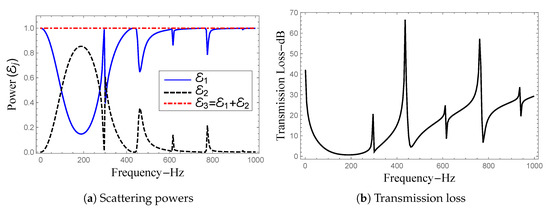 The reflected power, transmitted power, and transmission loss found in (45), (46), and (47), respectively, for the expansion chamber problem, are numerically shown against various parameters in Figure 9, Figure 10, Figure 11 and Figure 12. In Figure 9, the scattering power components and transmission loss versus frequency in regime Hz, while, m, m and m, are displaced. In Figure 9a, the reflected power is reduced up to about 20 percent at Hz, and then reaches to its maximum position at Hz. After this point, the reflected power varies sharply and then varies with dips occurring at membrane cut-ons to maximum level; whereas, the transmitted power behaves conversely such that sum of reflected and transmitted energies at each point is unity, see Figure 9a. The transmission-loss profile against frequency is displaced in Figure 9b. The peak value of transmission loss appears at Hz; whereas, the associated stopband in this regime is narrow. However, the width of stopbands appearing on the next frequencies is comparatively higher than the width of the previous stopband. Nevertheless, an increasing behavior in the transmission-loss curve along with spikes on the variation of frequency is evident.